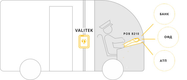 Терминал кондуктора (водителя) NEW 8210 может подключаться по кабелю или по Wi-Fi, что позволяет паралельно со стационарными валидаторами производить оплату проезда в салоне автобуса.